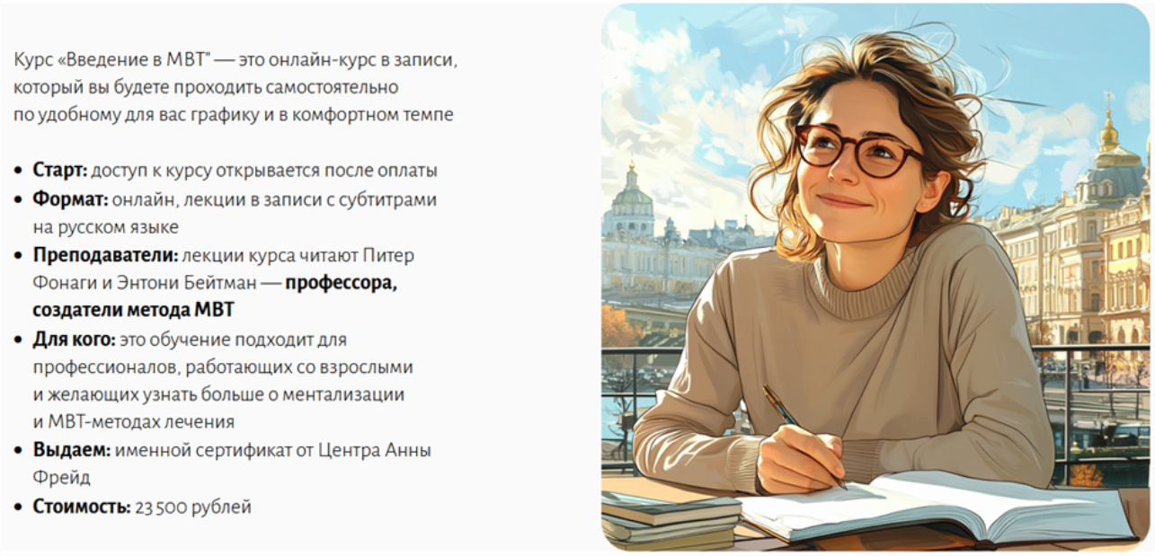«живой» онлайн-курс на русском языке с преподавателем — создателем метода Энтони Бейтманом и сертификатом от Центра Анны Фрейд, Великобритания